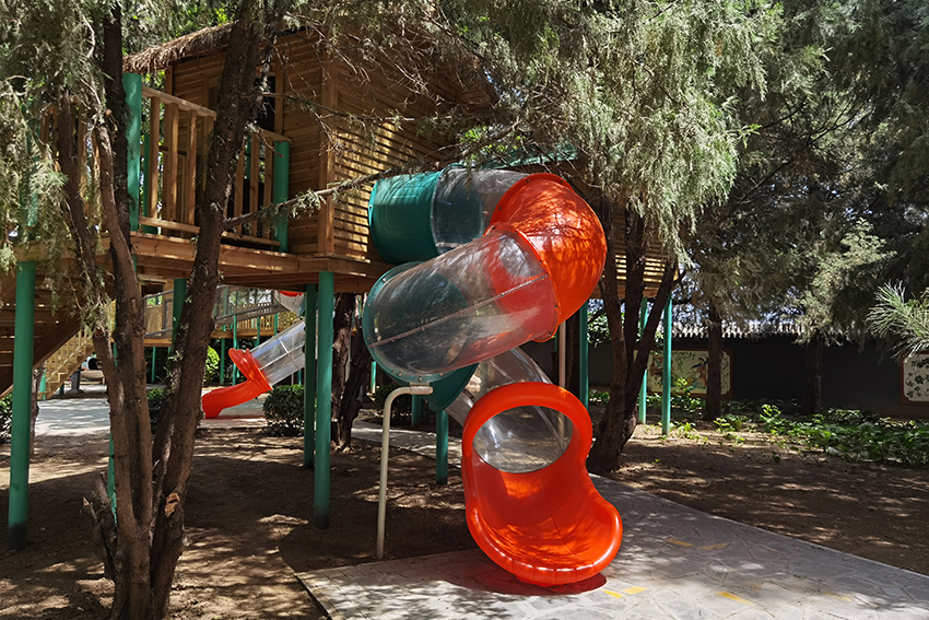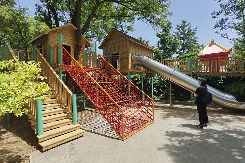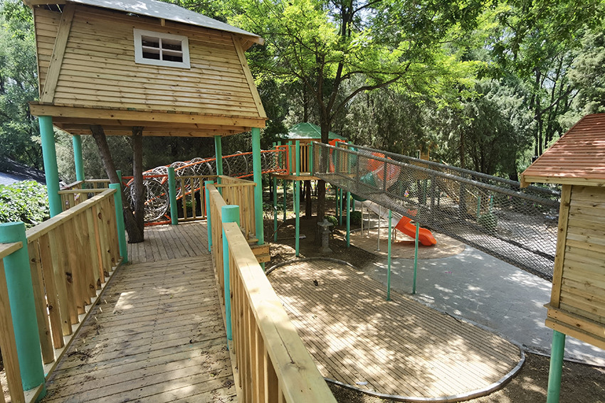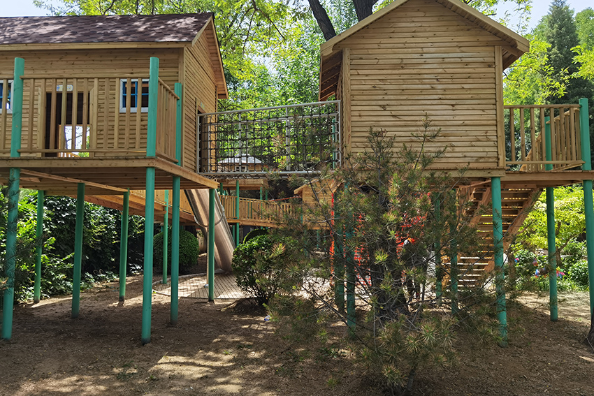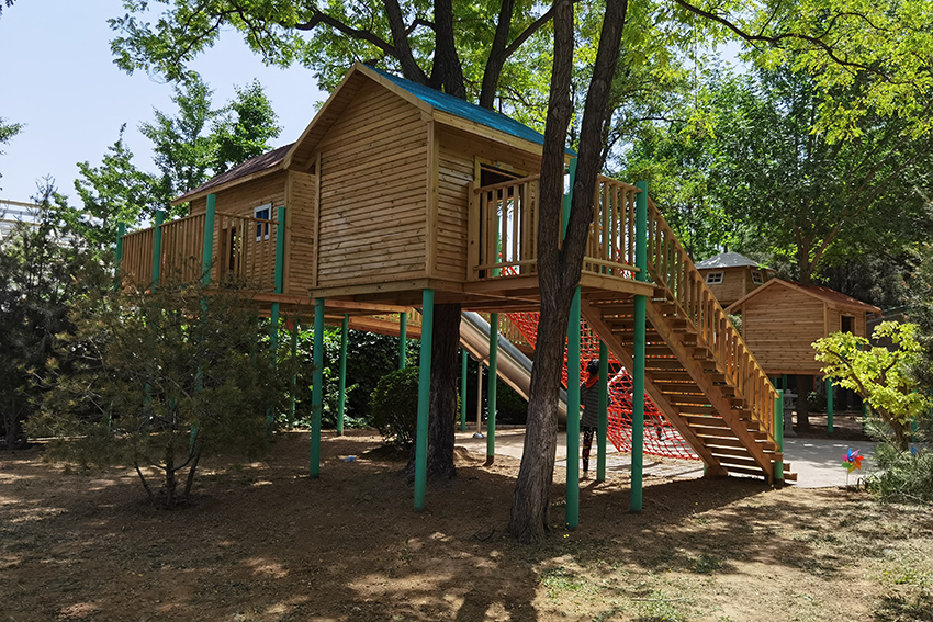 孩子們可以選擇攀爬網(wǎng)或是樓梯到達木屋,然后從不銹鋼滑梯上滑下來。