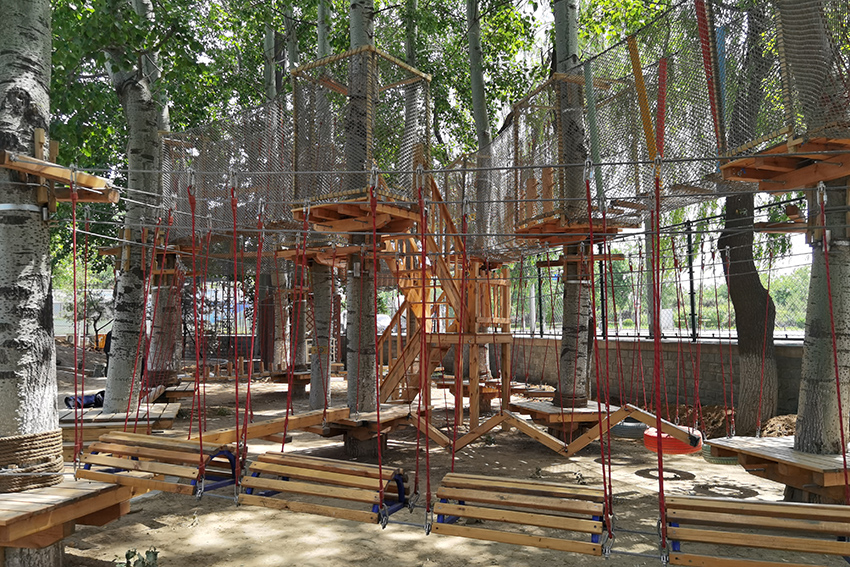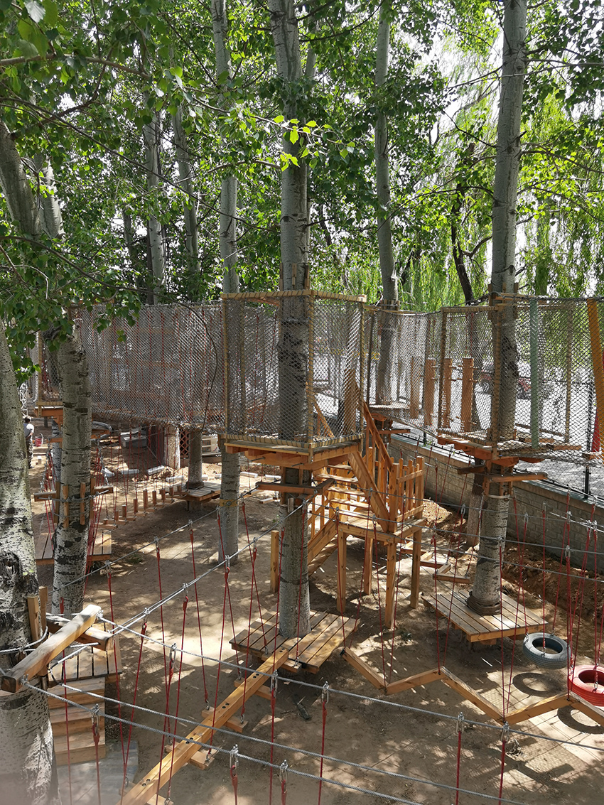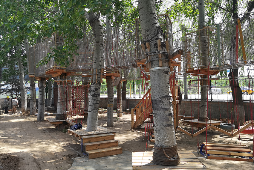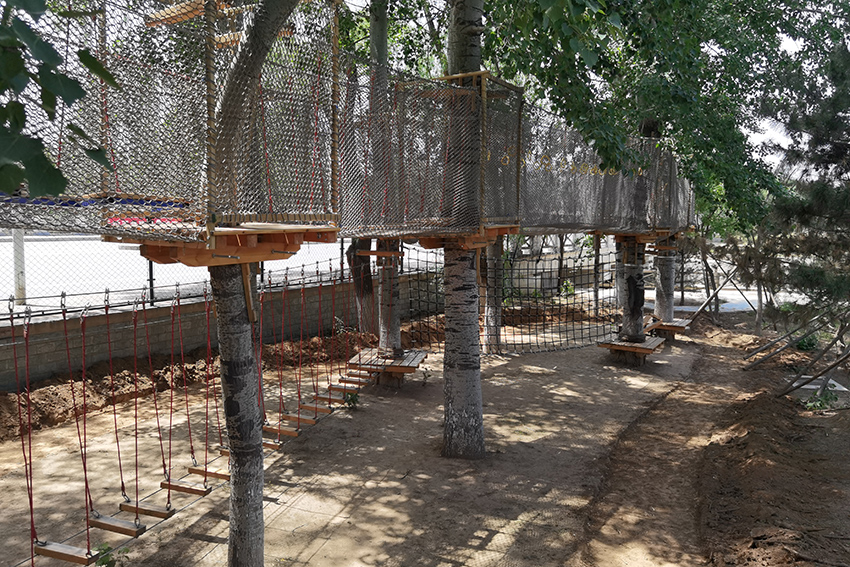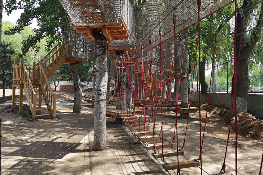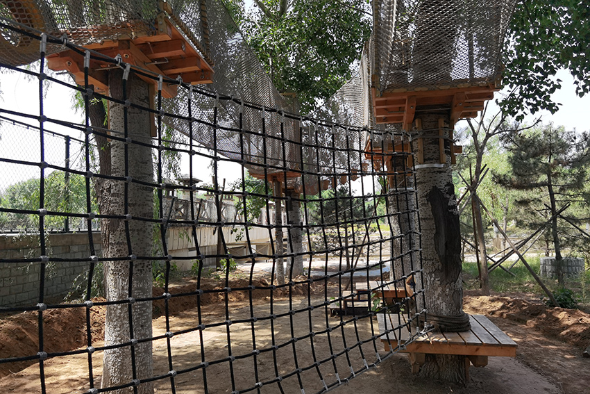 下面是拓展區(qū),適合孩子體能訓(xùn)練,有繩網(wǎng)的保護,高空行走也很安全。